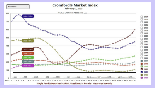 If you were looking to buy "steal" in Chandler, or in most of the Valley, your time has passed.We have already moved into a Seller's Market, as you can see from this chart. In fact, we are currently about the same level as we were at this time in 2017 and 2019. Do you remember what appreciation was back then? From Feb 2016 to 2017, overall appreciation by sf was 4.6%. From Feb 2018 to 2019, it was 5.9%. If the volume of sellers and buyers remain at this level, we should expect to have that same success this year. Our "norm" is about 4-6% appreciation within a year.If you own a home valued at $600k and appreciation is 5%, that will be an increase of $30k in a single year. Well worth it!