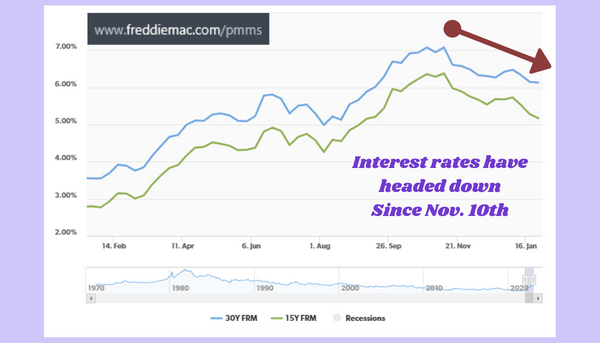 Most folks think that mortgage interest rates are somehow connected to Fed rate. Instead, it is connected with the 10-year bond market. Even though the Fed rate has continued to climb, the positive stats showing inflation is getting under control has led to mortgage rate declines.