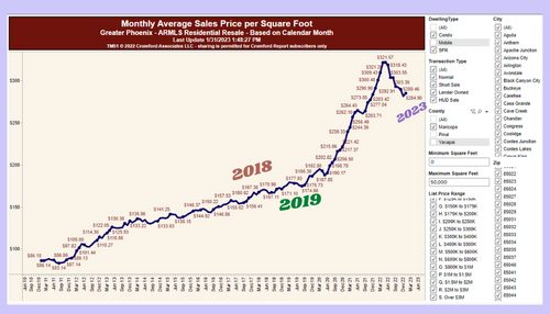 As you can see on this chart, houses appreciated beautifully both in 2018 (increase of 8.3% in housing values in Maricopa) and in 2019 (increase of 5%). I will do a happy dance to get back to consistent, smooth appreciation like we had from 2011 through the end of 2019. (Is it me or am I sounding like an older person reminiscing about the good ole days? Well, I am dagnabit!