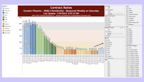 A: Yeppers. As you read above, and can see in this chart, we are seeing an increase in the Contract Ratios (number of Active listings divided by the number of homes in escrow). What you don't see on this chart is that this is normal for January. Sellers are waking up after their holiday slumber and beginning to put their homes on the market. Buyers, who tend to prefer flip flops to warm boots, will then jump into the fun. (That is unless something crazy intense happens to ruin things, of course.)